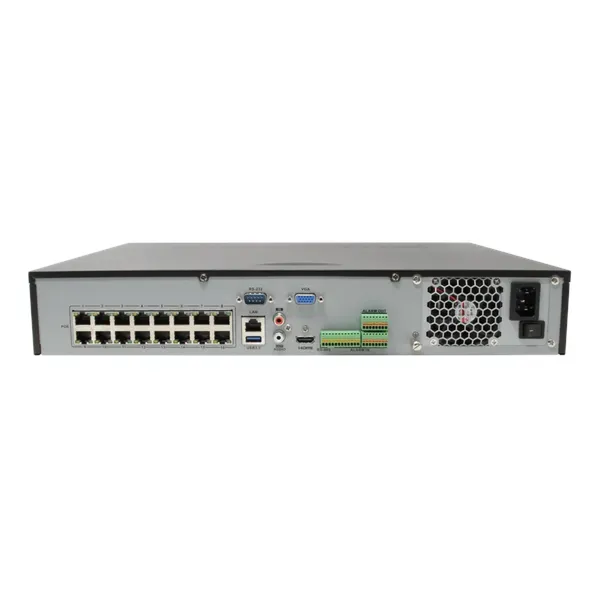 Professional 16-channel NVR supporting up to 12MP IP cameras, featuring 16 built-in PoE ports and 4K video output support.